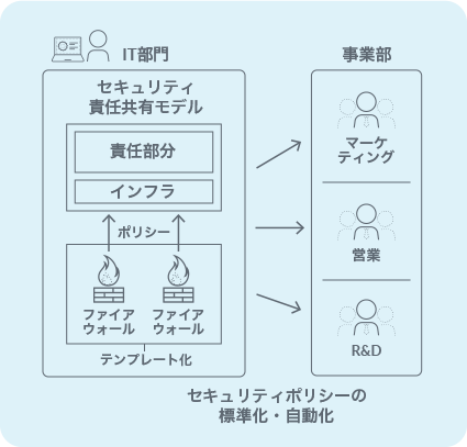 パロアルトネットワークスのツールでは、企業・組織のセキュリティポリシーに沿った構成を標準化し、構成の展開を自動化できます。自動化にはInfrastructure as Code と呼ばれる手法を用いて、クラウド利用のメリットである迅速な展開や、展開にかかるコストを削減することが可能です。セキュリティのノウハウに長けているIT部門が標準化された構成を定義し、事業部門のニーズに応じて自動化による展開を行うことで、企業がとるべきセキュリティ対策への負荷は大きく削減されるでしょう。