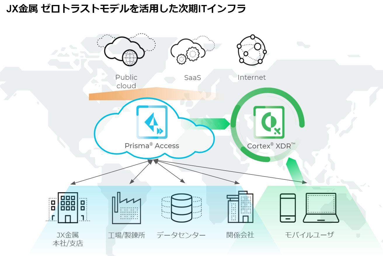JX金属は、パロアルトネットワークスのセキュリティプラットフォームにより、テレワーク環境の利便性と安全性を向上させデジタルトランスフォーメーション(DX)に対応すると共に、ネットワーク・セキュリティの可視化やガバナンス強化を進め、グループ全体でのゼロトラストの実現を目指します。同社は、パロアルトネットワークスの包括的なクラウド提供型セキュリティPrisma Accessと、あらゆるソースのデータを統合してサイバー攻撃を阻止する検出・対処プラットフォームCortex XDRをDX推進のセキュリティの基幹としました。