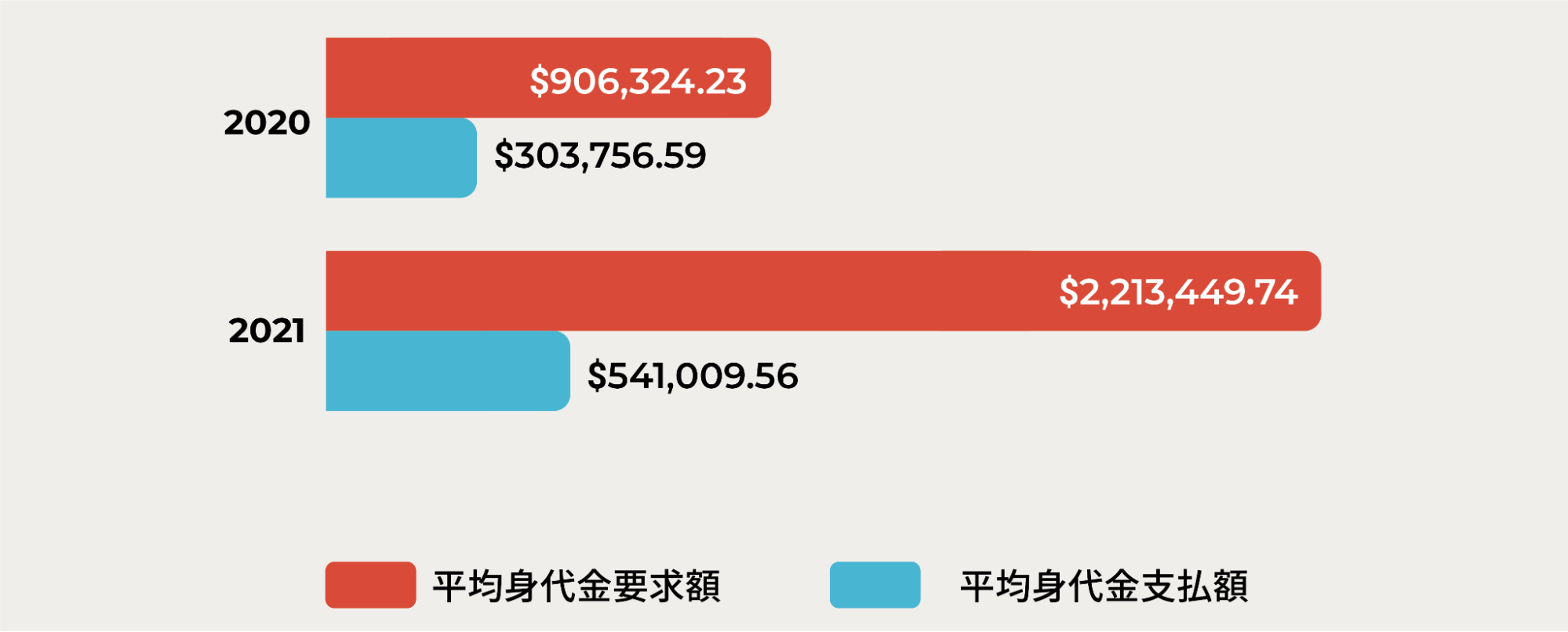 グラフ①:2020年と2021年の身代金の平均支払額・平均要求額の比較