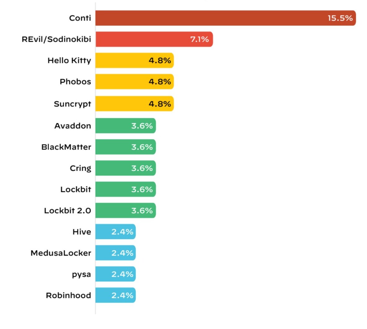 さらに、グローバルで最も活発に活動していた攻撃グループは、「Conti」で、Unit 42が関与した事例のおよそ5分の1となる15.5%の事件を引き起こしていました。「Sodinokibi」としても知られる「Revil」は7.1%の2位、「Hello Kitty」や「Phobos」、「Suncrypt」が、それぞれ4.8%で続きます。