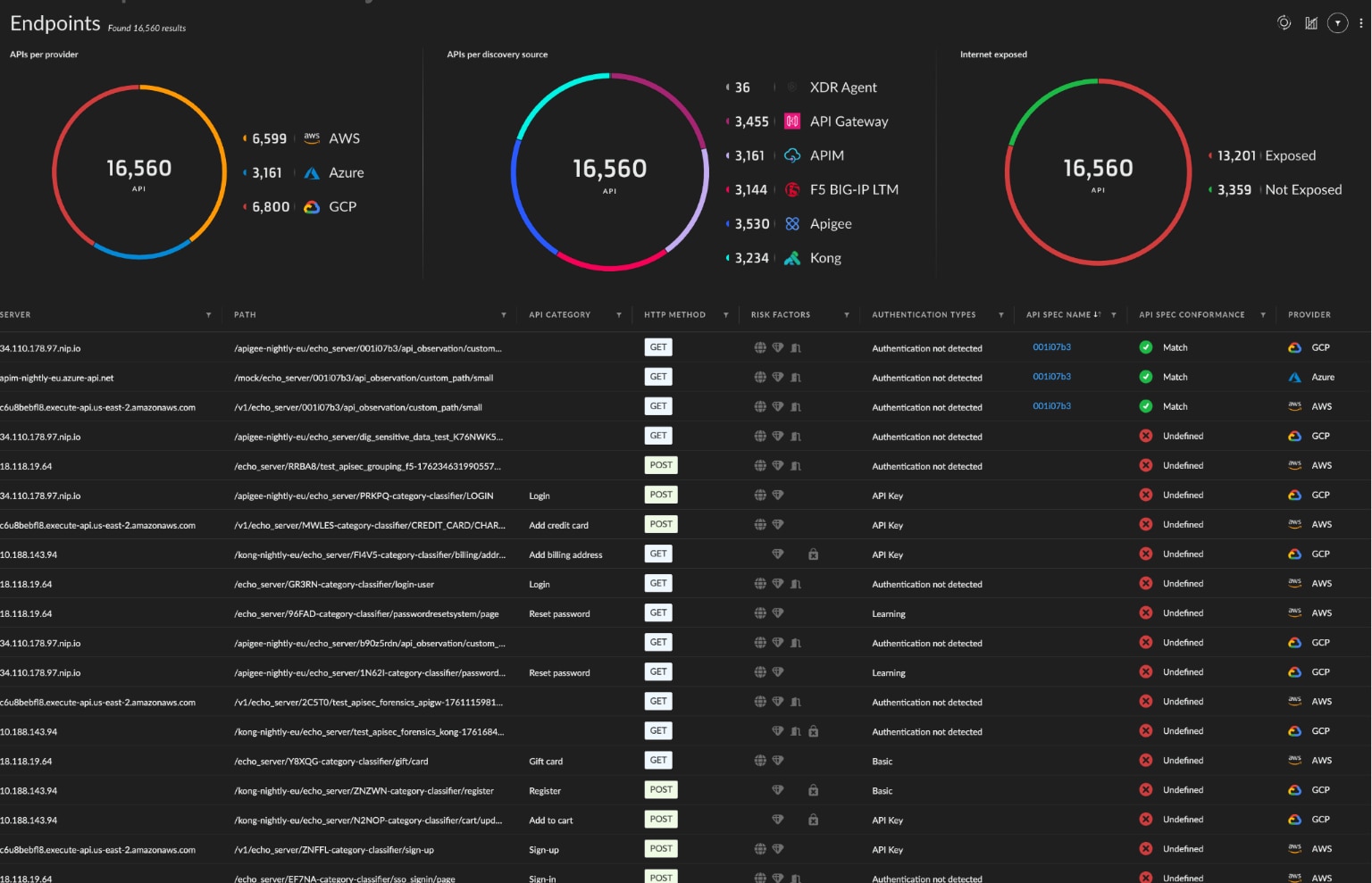 APIランドスケープ全体を可視化し、死角をなくす。ゲートウェイ、ワークロード、クラウド環境にまたがるAPIを自動的に検出し、検証します。シャドーAPI、ゾンビAPI、アンマネージドAPIを発見し、完全な可視化と制御を実現します。