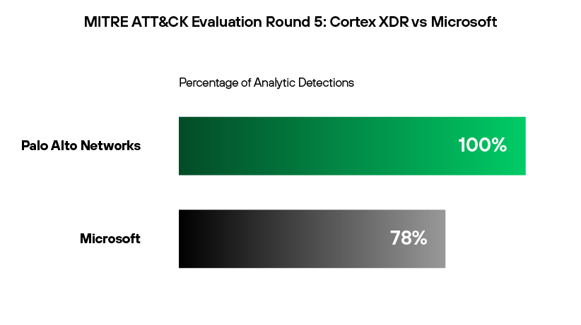 昨今の国家の支援を受けた攻撃を効果的に防ぐために求められる可視性と検出能力に関する高度な要件を、Microsoft Defender XDRでは満たせません。2023 MITRE ATT&CK Evaluations(Turala)の評価テストでは、ロシア連邦保安庁が用いるネットワーク インプラントとバックドアに対するEDR製品の能力が試されました。その結果、Cortex XDRの分析検出率は100%でしたが、Microsoftは78.3%でした。言い換えれば、Cortex XDRが全サブステップで検出に成功したのに対し、Microsoftは試験対象のサブステップの21.7%でエンドポイント検出に失敗していることを意味します。