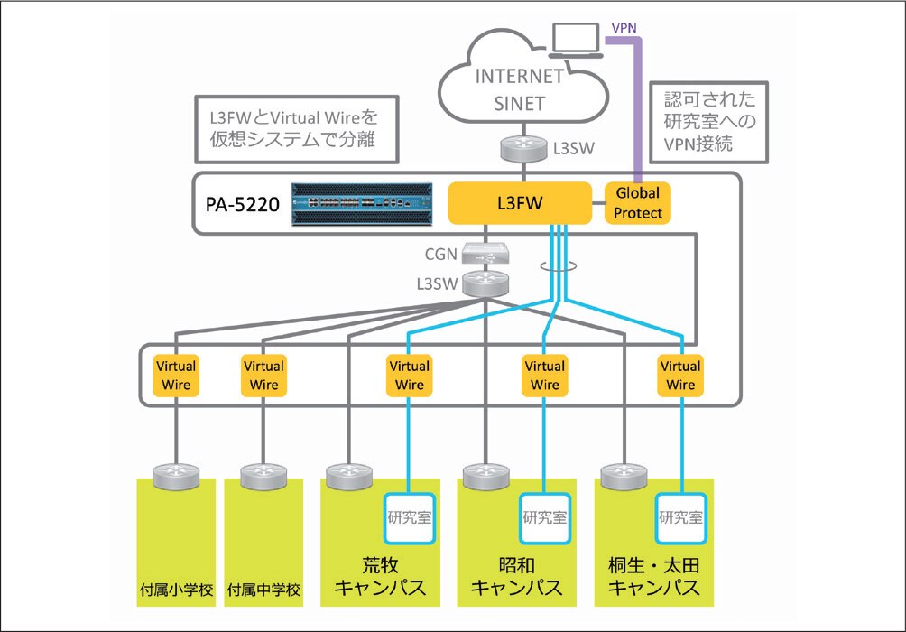 「マイクロセグメンテーションの導入に伴い、PA-5220を利用して学内間の通信に対する通信制限を行うことにしました。各研究室などに合計約500のサブネットを割り当て、この通信を全てPA-5220で監視・制御する構成としています。今回、PA-5220にVPN機能を統合しており、学外から研究室のアクセスにはVPN経由で接続します。従来のVPN接続では多要素認証を導入できずにいましたが、PA-5220にはVPNのSAML連携機能が用意されているので、その機能を利用して学内で運用しているシングルサインオン(SSO)の機能と組み合わせ、VPN接続の二要素認証を実現しています。VPNの認証時にはユーザが所属している研究室・部署の情報とUser-ID機能を連携させることで、ファイアウォールポリシーを変更することなくユーザーのアクセス制御ができるようになっています。また、学内では各研究室のサブネット間をアクセス禁止にしたため、サブネット間で通信したい場合もPA-5220にVPN接続することで許可されたユーザーのみが通信できるようにしています。」(浜元氏)