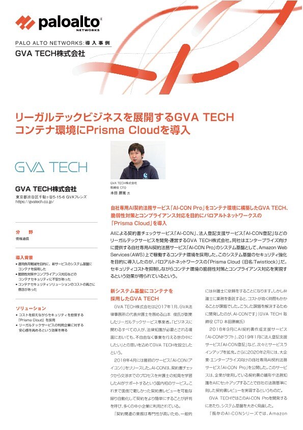 AIによる契約書チェックサービス「AI-CON」、法人登記支援サービス「AI-CON登記」などのリーガルテックサービスを開発・運営するGVA TECH株式会社。同社はエンタープライズ向けに提供する自社専用AI契約法務サービス「AI-CON Pro」のシステム基盤として、Amazon Web Services(AWS)上で稼働するコンテナ環境を採用した。このシステム基盤のセキュリティ強化を目的に導入したのが、パロアルトネットワークスの「Prisma Cloud( 旧名:Twistlock)」だ。