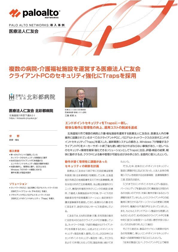 北海道旭川市で複数の病院と介護・福祉施設を運営する医療法人仁友会は、医療法人内の事業所に設置されているすべてのクライアントPCに、パロアルトネットワークスの次世代エンドポイントセキュリティ「Traps」を導入した。基幹業務システムの都合上、Windows 7が稼働するクライアントPCをメーカーサポート終了後も使い続けなければならない事情があり、一定レベルのセキュリティ環境を確保・強化できるソリューションとしてTrapsに注目。評価・検証の結果、軽快に動作する点、クラウドによる集中管理が可能な点が決め手となり、全面的に導入。