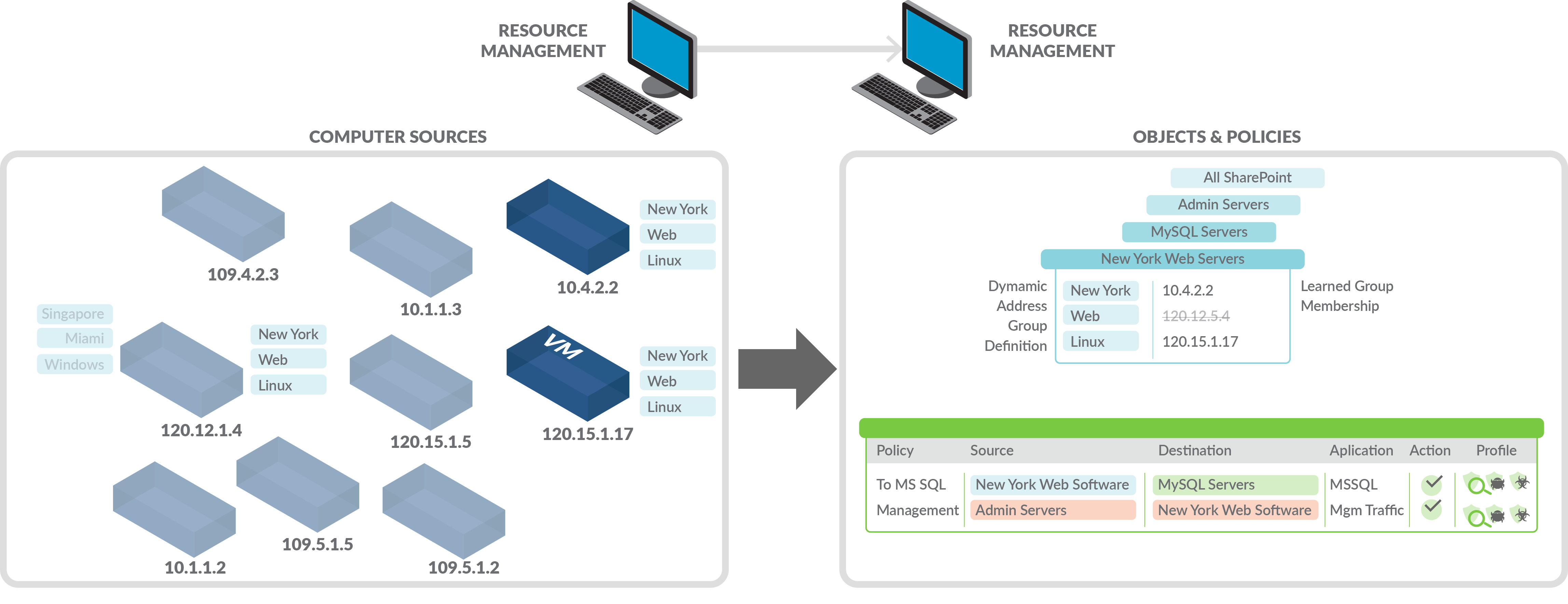 ネットワークには、ファイアウォール ポリシーに影響を与えるシステム コンポーネントとデータ ソースが混在しています。これまでユーザーは、制御のベスト プラクティスが変更されるたびにファイアウォール ポリシーを手入力して更新する必要がありました。これにより、ビジネス イニシアチブの実施が遅れることも少なくありませんでした。