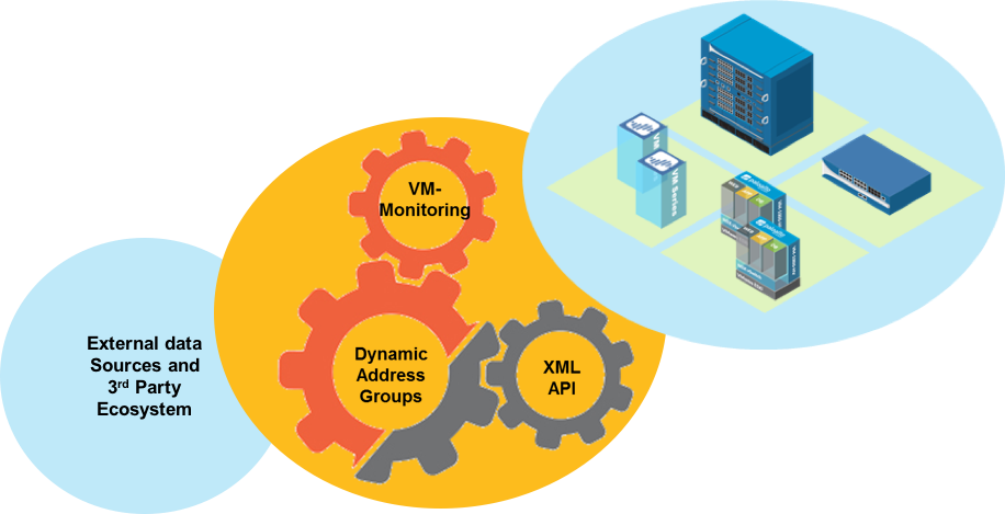 ビジネスの遅れにつながるポリシー更新の時間ギャップを排除するために、XML API、ダイナミック アドレス グループ、VMモニタリングなどのネイティブ管理機能では、弊社の仮想フォーム ファクタおよび物理フォーム ファクタからなる次世代ファイアウォールを、外部ソリューションとデータ ソースと統合することができます。