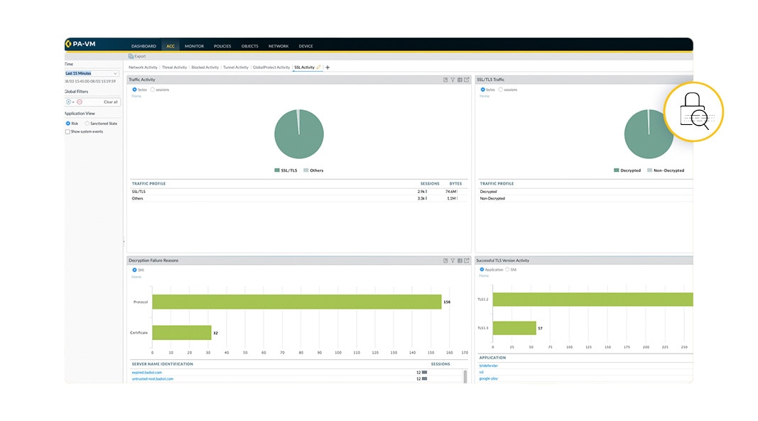 暗号化トラフィックは検査されないため、組織はそのトラフィックに含まれるセキュリティ リスクに気付きません。ハッカーはこの可視性の欠如を利用して、暗号化されたトラフィックの中にマルウェアを送り込む。PAN-OSは、TLS 1.3やHTTP/2を含むTLSおよびSSL暗号化トラフィックの包括的な復号化を提供します。