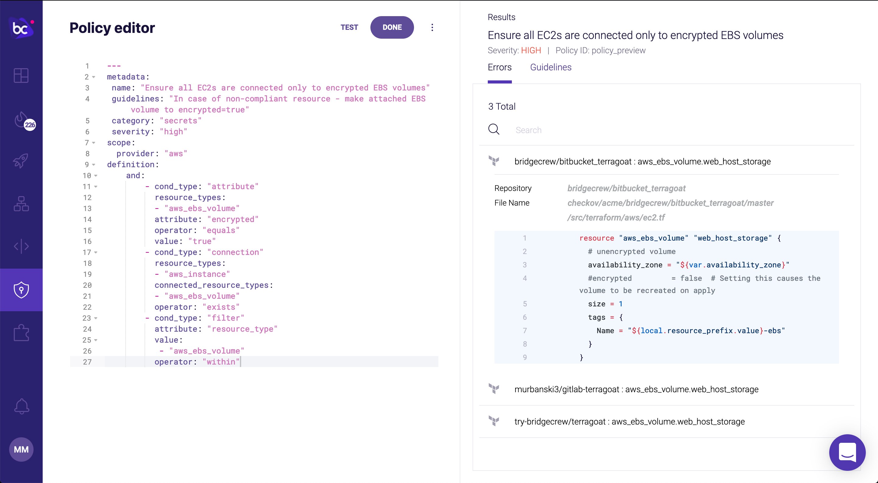 - 設定ミスの詳細なコンテキストを組み込む- Bridgecrewは、IaCリソースの依存関係と開発者の最新の修正を自動的に追跡し、大規模チームでのコラボレーションを向上させます。