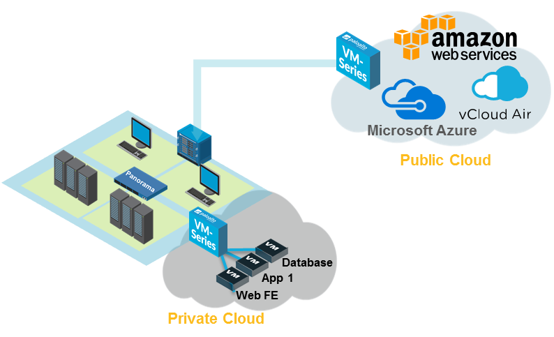 VM-Seriesは、アプリケーション使用許可ポリシーを使用してパブリック クラウド インフラストラクチャを保護し、同時に既知および未知の脅威を阻止します。サポート対象のパブリック クラウド環境は、VMware® vCloud® Air™、Amazon Web Services (AWS)およびMicrosoft Azureです。