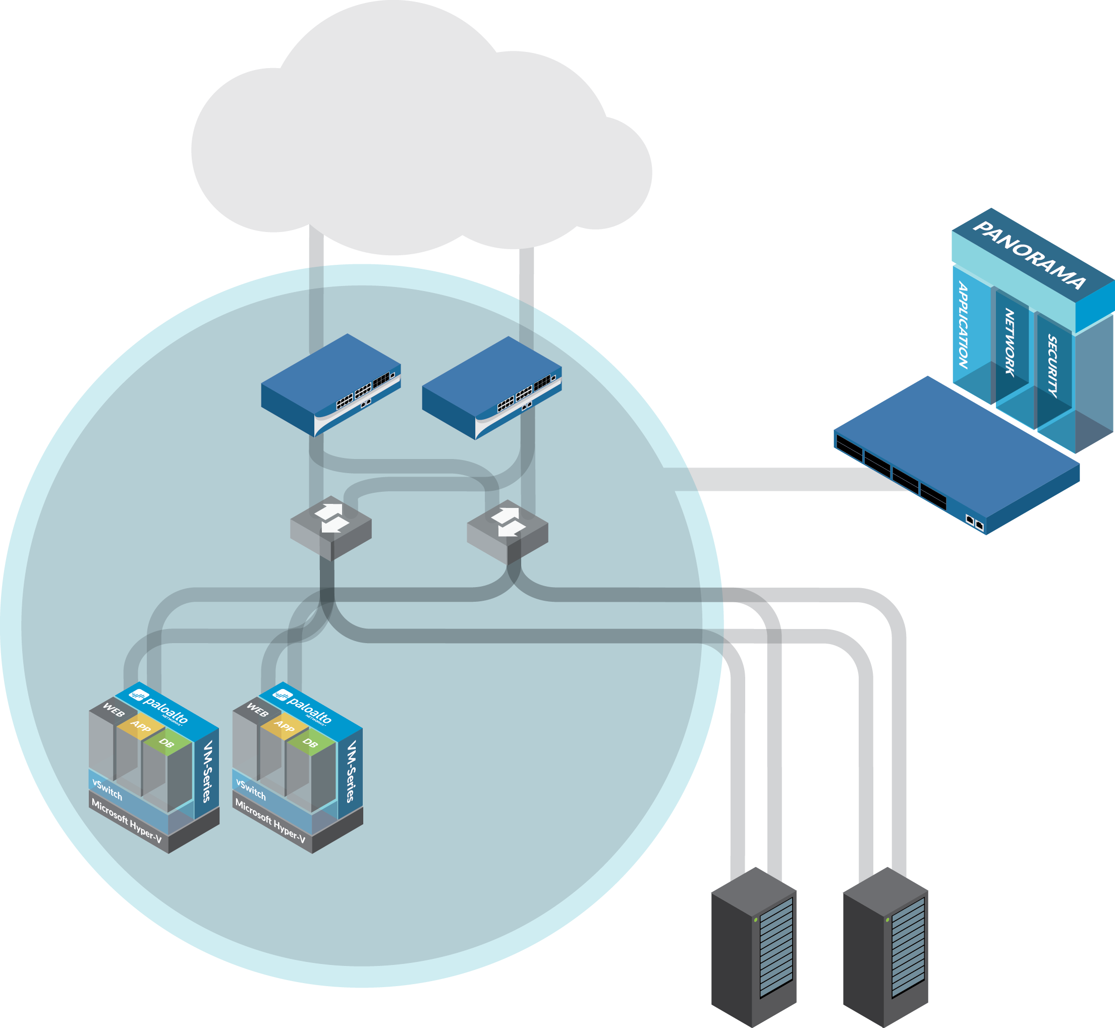 自社専用のクラウド コンピューティング環境の構築に着手している組織の場合、VM-Series for Hyper-Vを導入することで、パロアルトネットワークス®次世代ファイアウォールおよび高度な脅威防御のすべての機能を、クラウド コンピューティングの境界を通過するトラフィックに適用することが可能になります。
